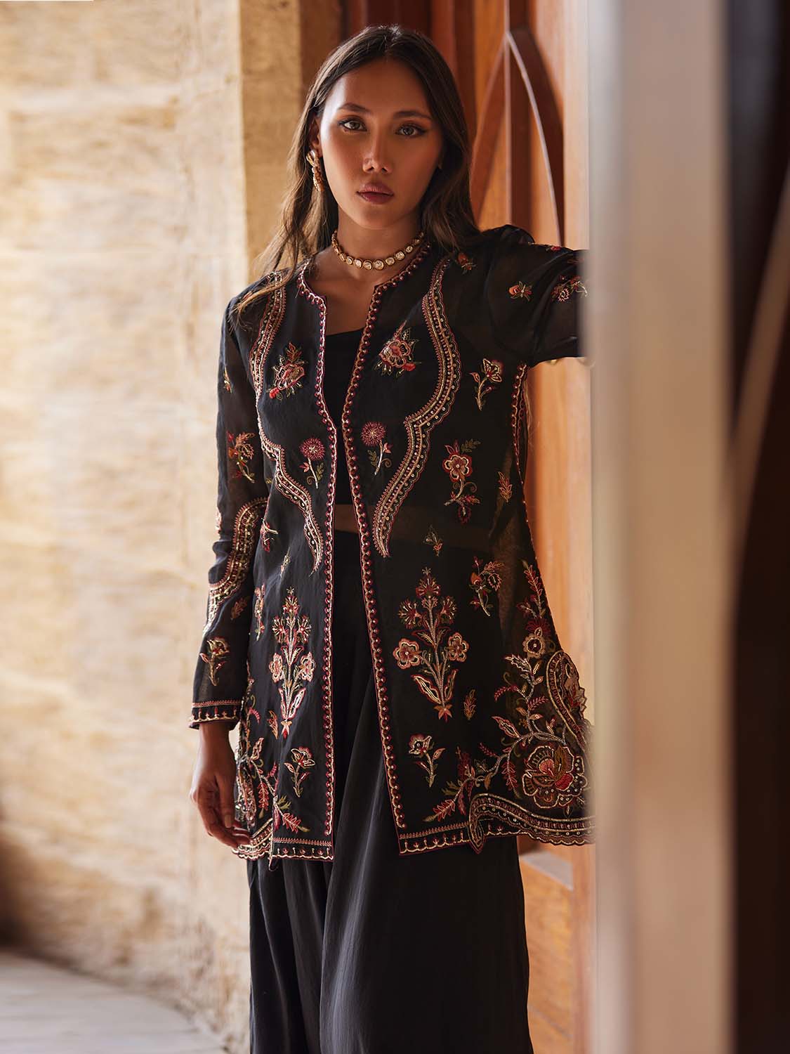 Embrace easy-going elegance this season with our black Borgia coat, showcasing multi hued resham embroidery with zardozi work inspired by traditional and Mughal motifs, tailored to perfection for all your evening soirées. Paired with matching free flowing pants for a more defined look.